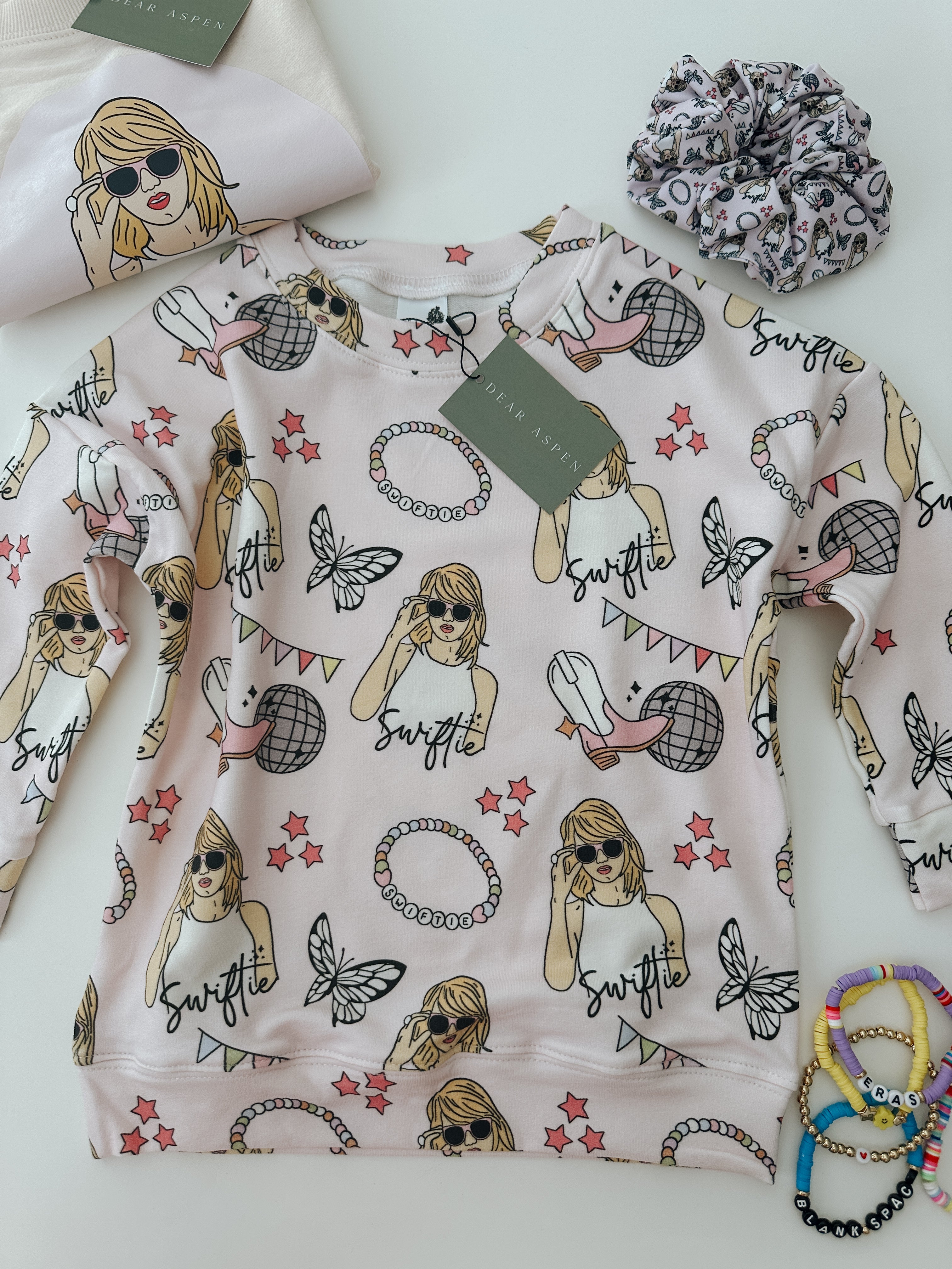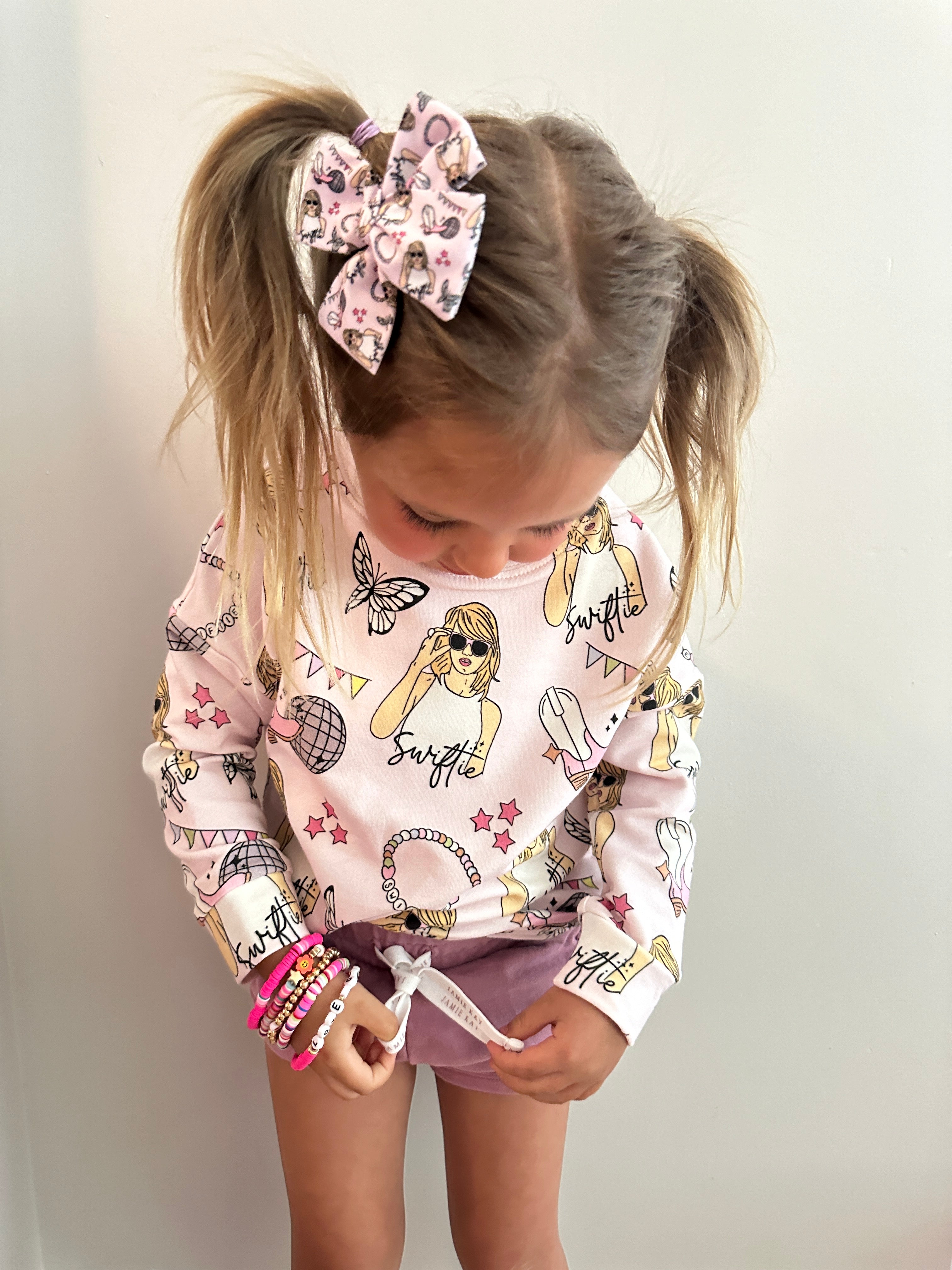 Get cozy in style with the READY TO SHIP Pink Tay Crewneck. Made with organic cotton, this custom exclusive print sweatshirt is perfect for any occasion. Made in Canada and available in sizes 0-3 to 6/7. Don't miss out, order yours now!